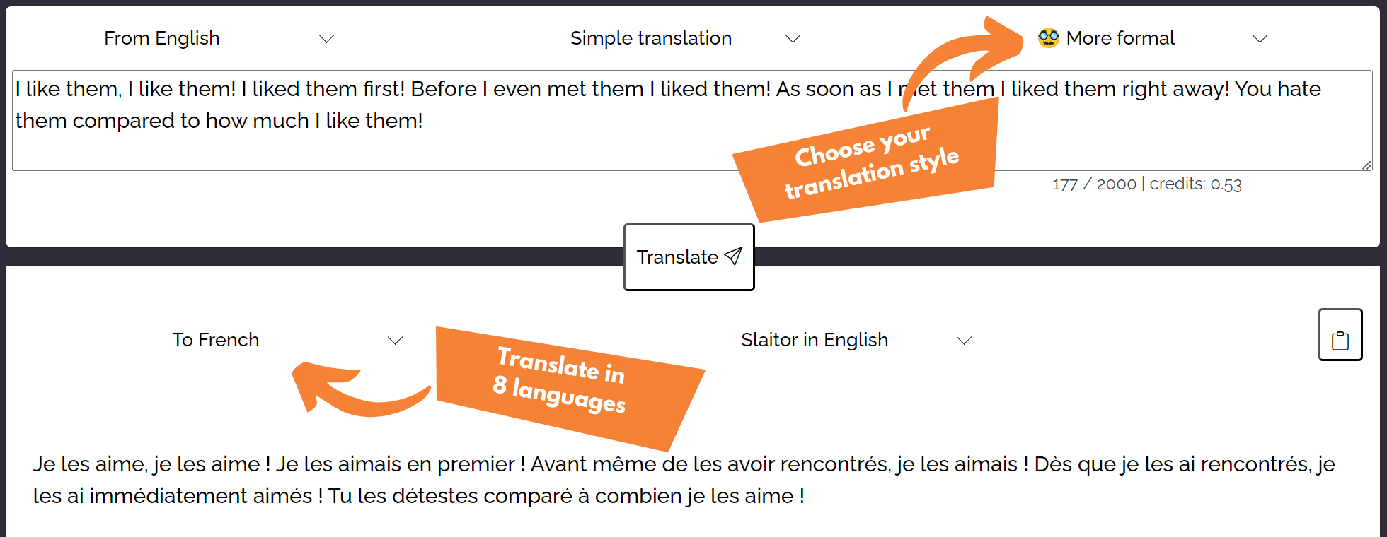 slAItor combines recent advances in AI (GPT) with more standard machine translation techniques. A new kind of system that does much more than just translating.