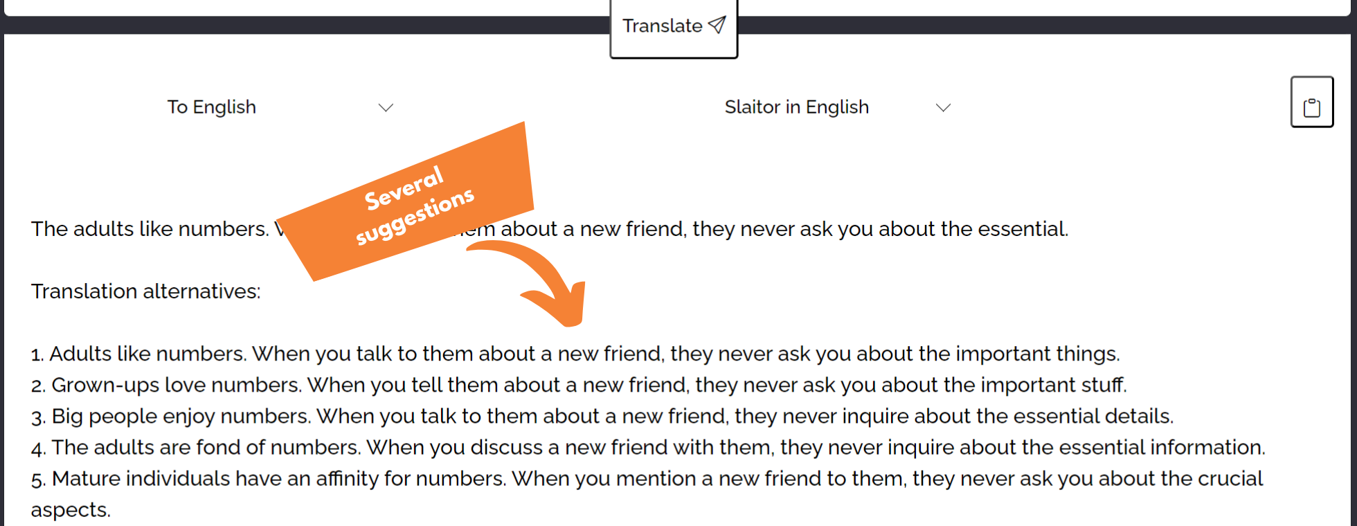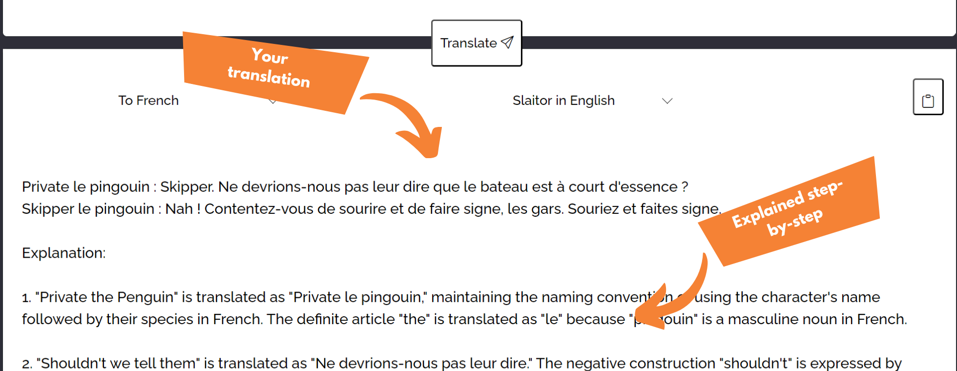 slAItor can explain a translation step-by-step and with details. You can use this unique functionality to learn or improve your understanding of a language.