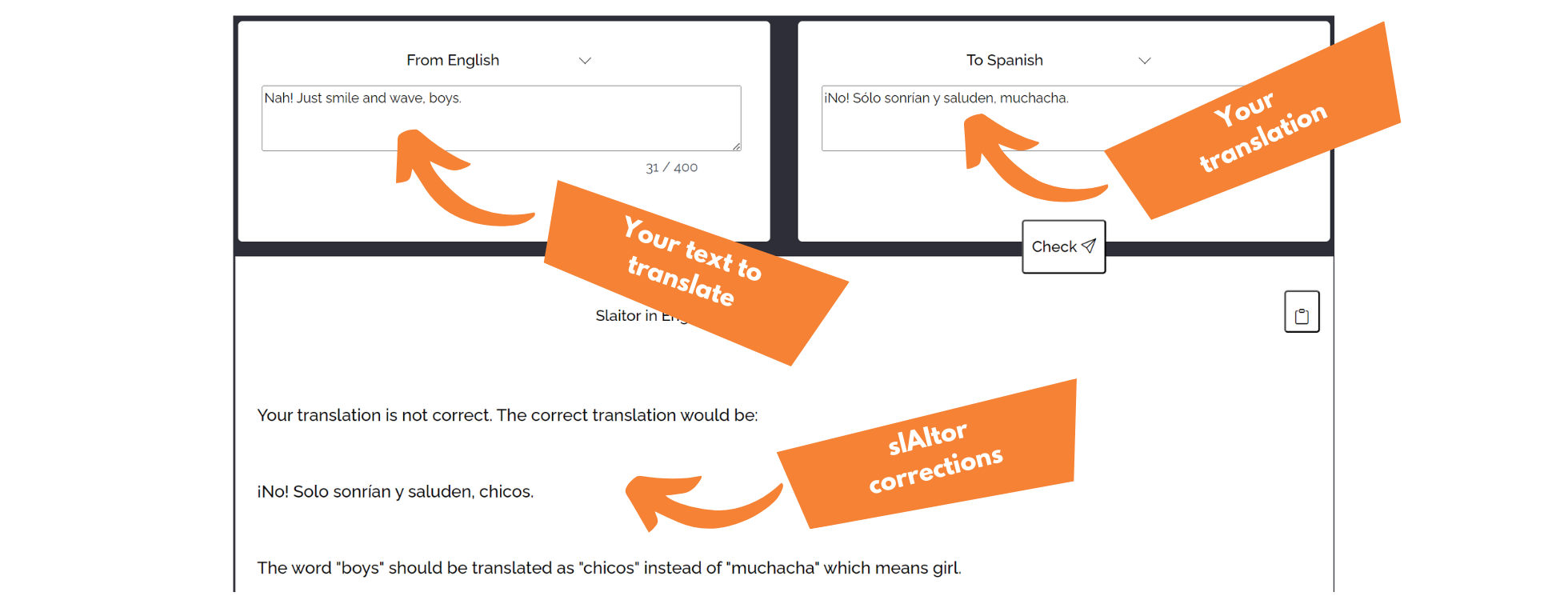 Thanks to the checker mode, you can provide your own translations to slAItor: It will spot, explain, and correct the errors.